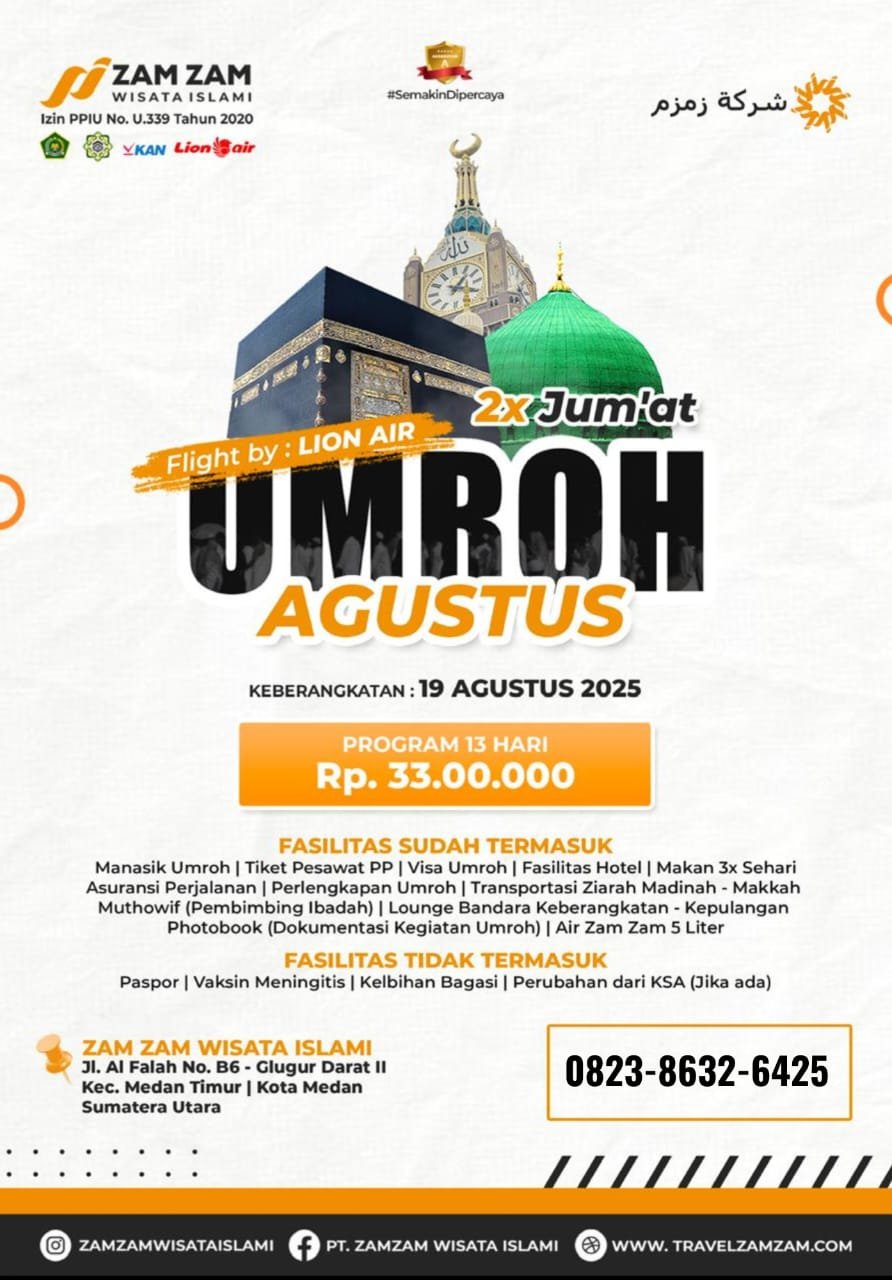 UMROH | 2x Jum’at 13 Days Program 13 Hari Maskapai Lion Air Ringkasan Jadwal Fasilitas Ringkasan Jadwal Fasilitas Zam Zam Wisata Islami Itinerary Expand all Day 1 : 19 Agustus 2025 Keberangkatan Harga Sudah TermasukManasik UmrohTiket Pesawat PPVisa UmrohFasilitas HotelMakan 3x SehariAsuransi PerjalananPerlengkapan UmrohTransportasi Ziarah Madinah - MakkahMuthowif (Pembimbing Ibadah)Lounge Bandara Keberangkatan - KepulanganPhotobook (Dokumentasi Kegiatan Umroh)Air Zam Zam 5 L Harga Belum TermasukPasporVaksin MeningitisKelebihan BagasiPerubahan dari KSA (Jika ada) Date & Time Package Type Back Continue Show Prices Dari Rp33,000,000 / Regular Dijamin harga terbaikTidak ada biaya pemesananPemandu lokal profesional Pesan Sekarang